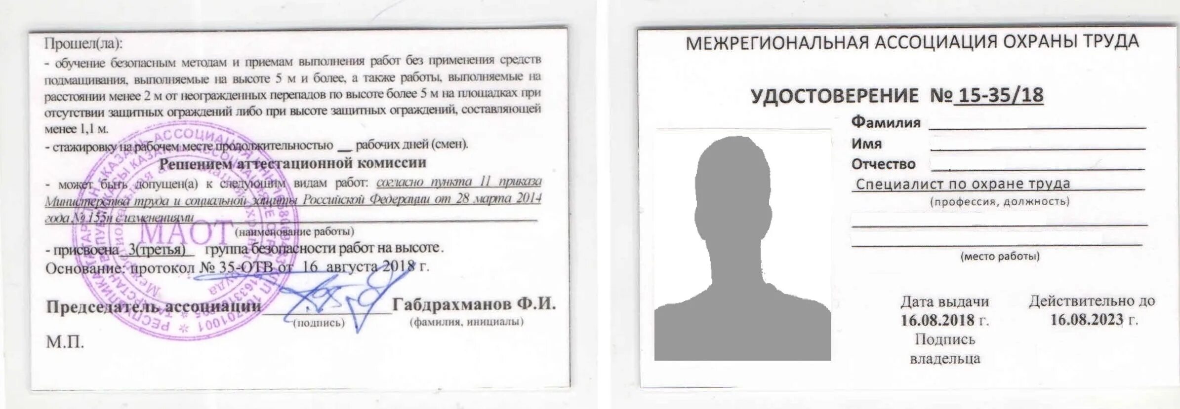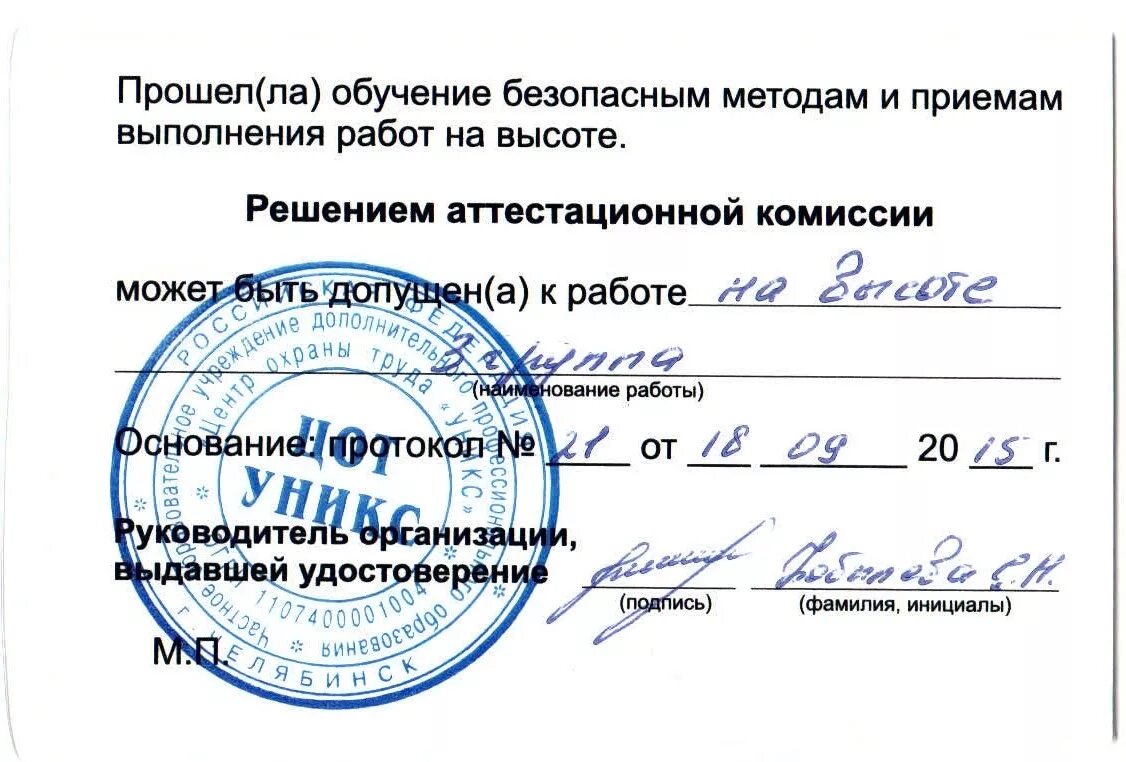 Удостоверение работы на высоте.