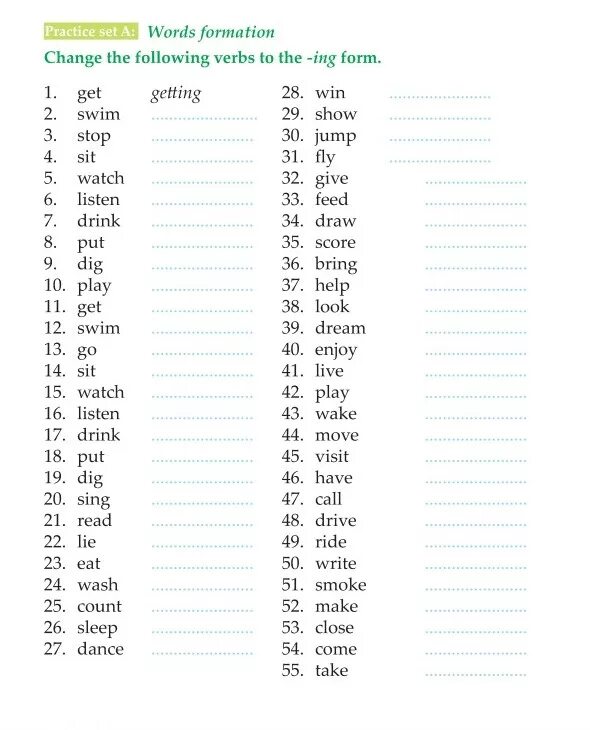 Form ing form the following verbs.