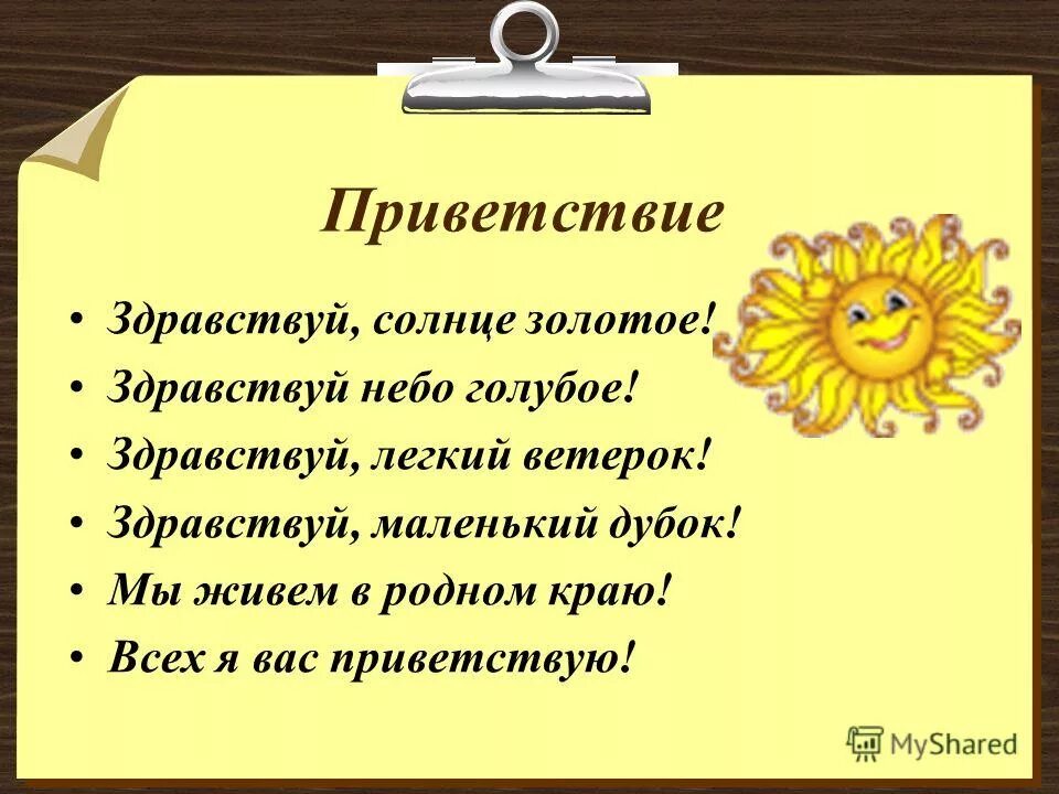 Приветствие Здравствуй солнце золотое Здравствуй небо голубое.