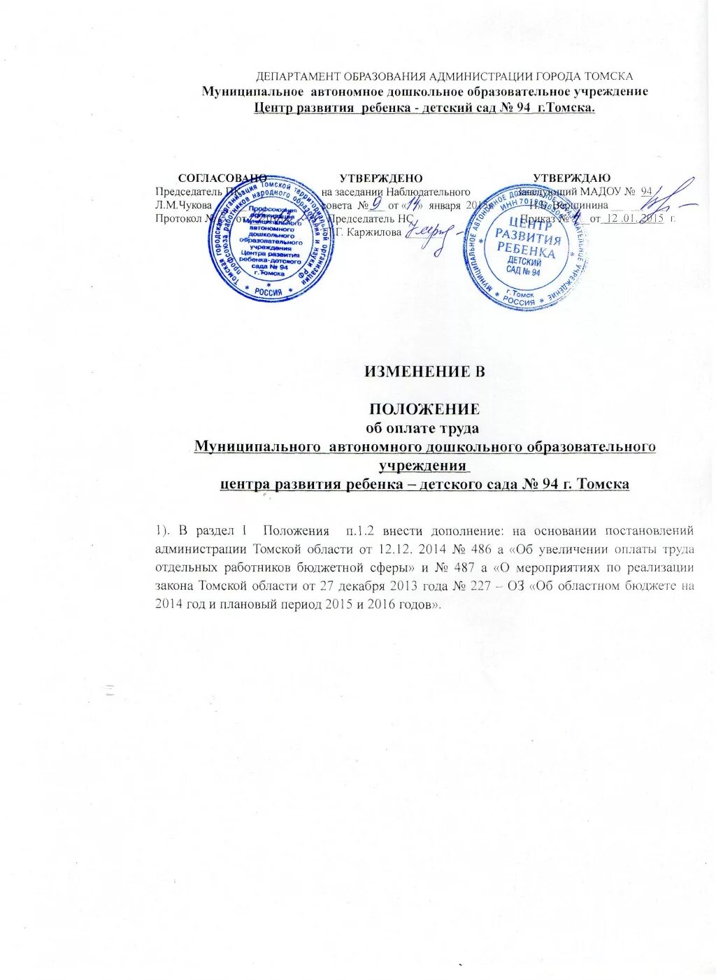 Приказ о внесении изменений в положение об оплате труда.
