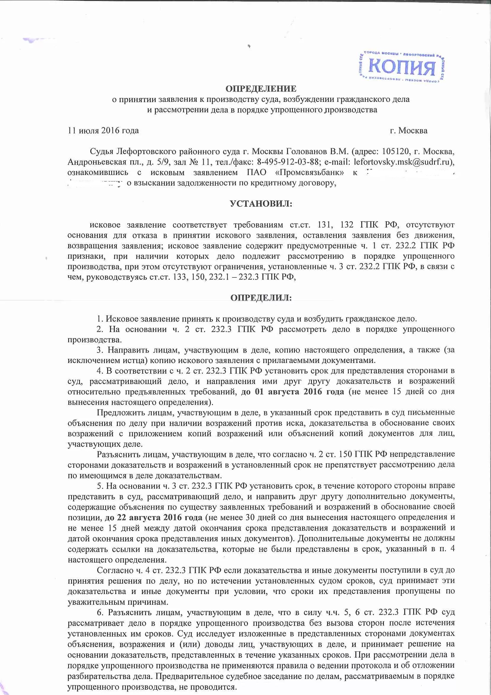 Определение о рассмотрении дела в порядке упрощенного производства.