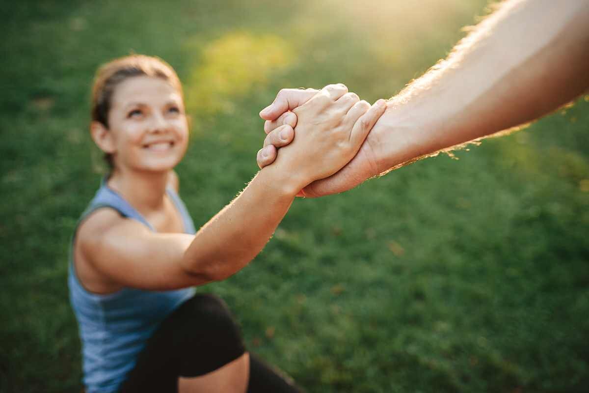 Человек помогает другому подняться.