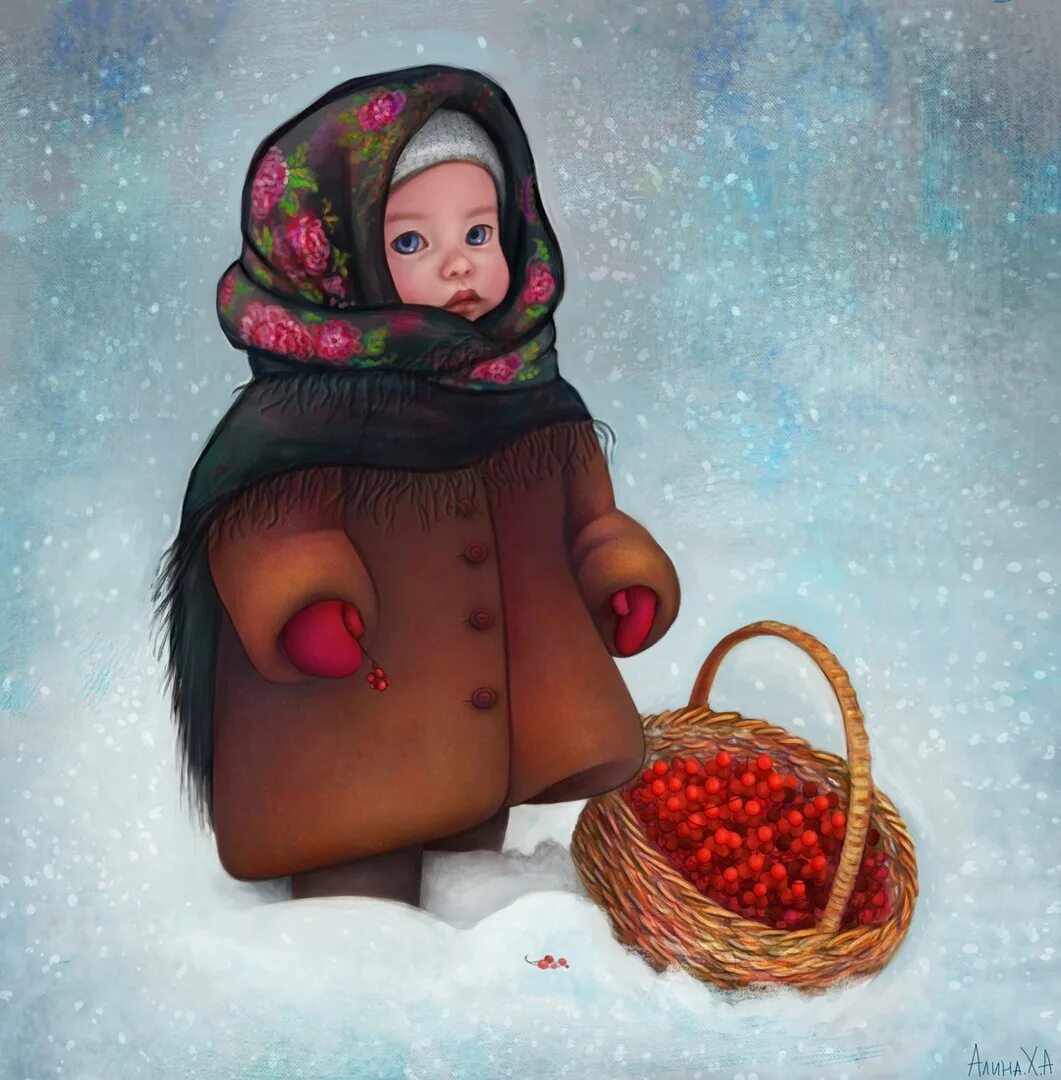 Рисованная девушка зимой.