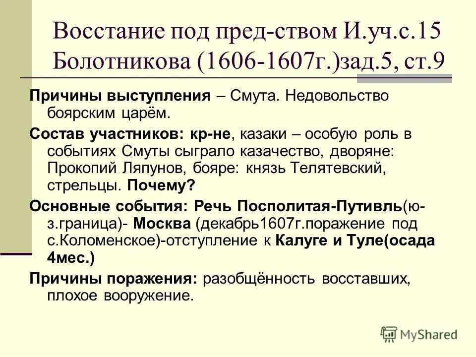 Причины Восстания Болотникова 1606-1607 таблица.