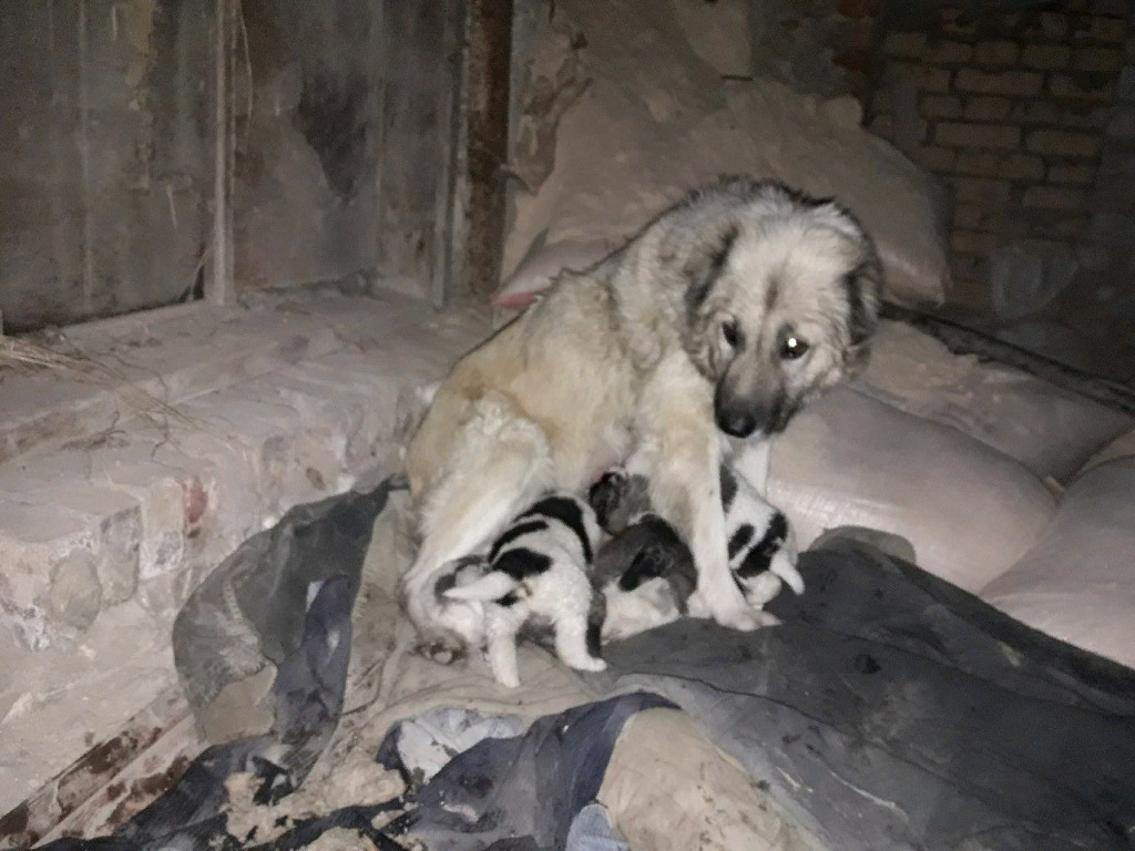 Бездомная собака с щенками.